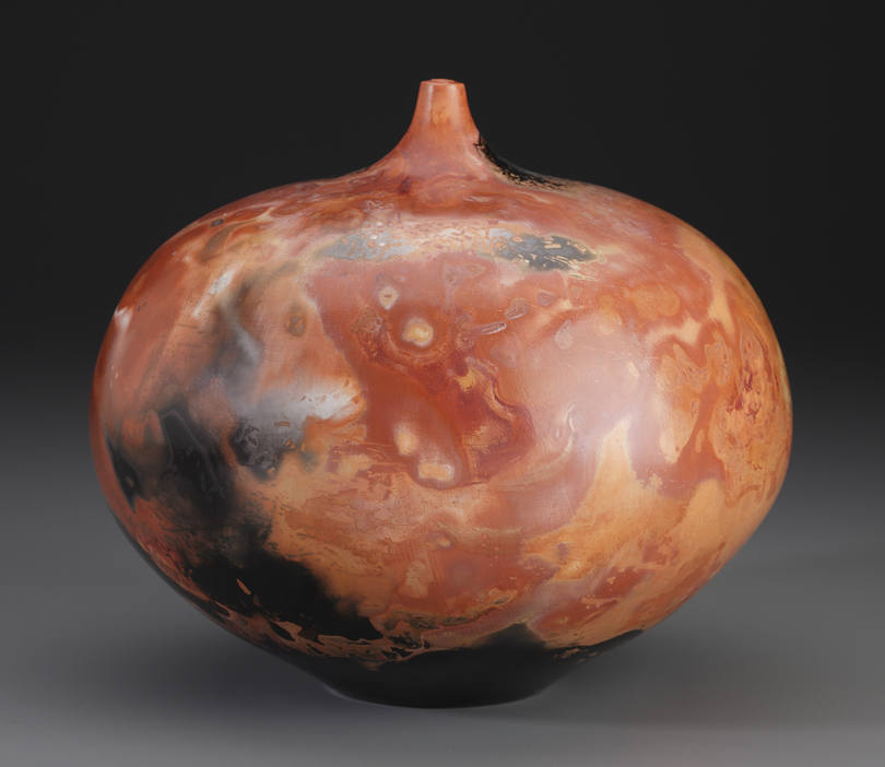 Bob’s burnished vessels are thrown using porcelain clay. This very smooth white clay lends itself to the burnishing process. Once the pot is completely dry and before firing in a kiln the pot is polished several times with a smooth stone, this is know as burnishing. The first time the pot is burnished a coat of baby oil is rubbed onto the surface of the pot and polished; this produces a smooth slightly shiny surface. The second burnishing involves the thin application of a clay slip called terra sigillata [which is Latin for Earth Seal]. Once the terra sigillata is applied to the smooth bone dry pot it is burnished a second time with a piece of fleece. A high gloss starts to develop on the surface of the pot. This process of burnishing terra sigillata is a technique Bob worked on while in graduate school.” I was looking for an unglazed surface for my clay pieces and I became very interested in early Greek and Roman pottery of the 5th century BC. I realized that the use of a clay slip for sealing and shining the surface of pots was a common practice for many cultures such as Native American, as well as potters’ of south and central Americas, just to mention a few.” Once the pot is burnished it is bisque fired for strength. The bisque fired porcelain is very white and shiny, but still porous. Each pot is then placed in a saggar or container which is made of bricks or clay. The pot is then carefully surrounded with hard wood chips, kosher salt and clay oxides. The saggar is sealed with the pot inside and fired again to about 1900 degrees Fahrenheit. The next day the pots are unloaded from the saggar cleaned and gently buffed revealing a beautiful surface obtained from the smoke and fumes trapped in the saggar with the porous pottery. While these results vary from piece to piece some control is obtain by the way the saggar is loaded and placement of organic material surrounding the burnished pot. . |